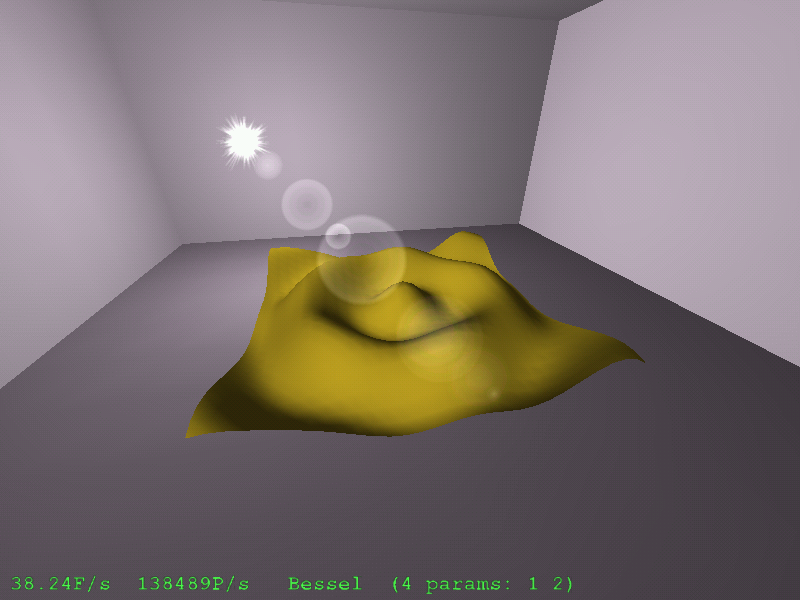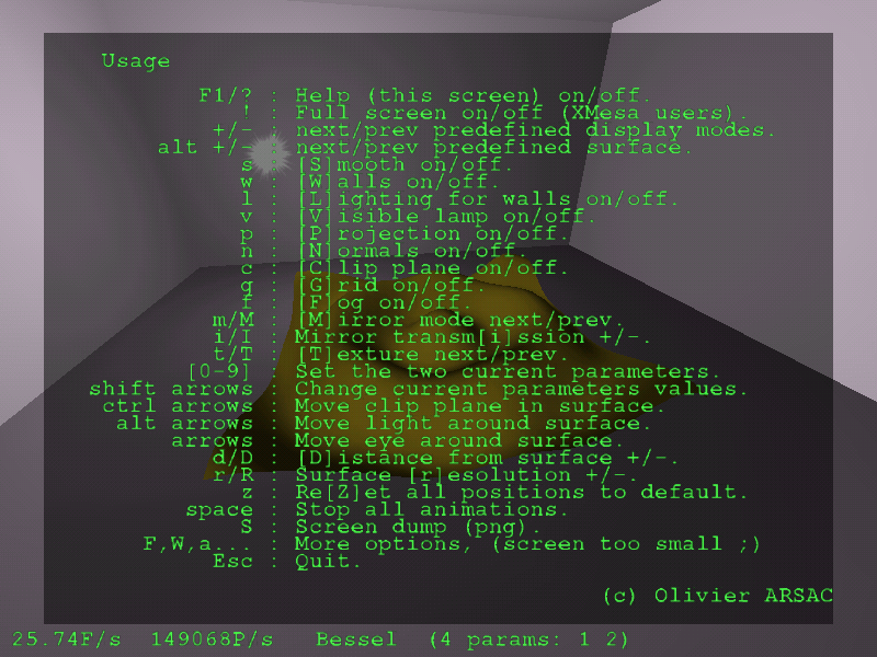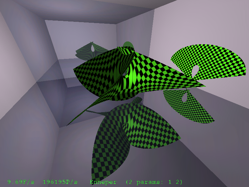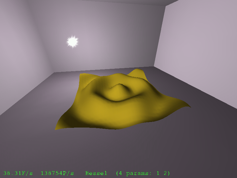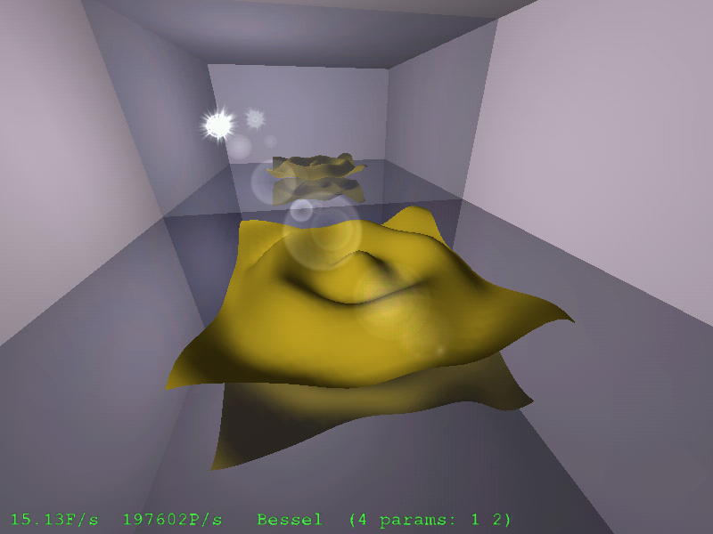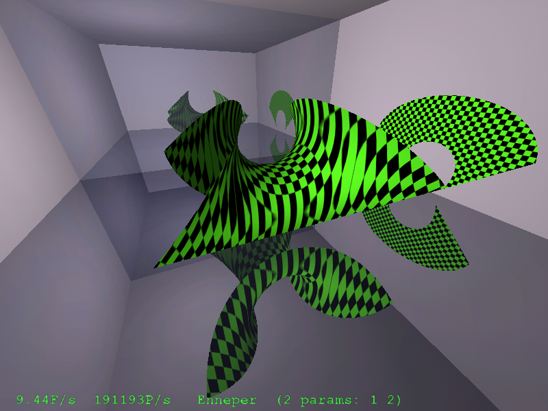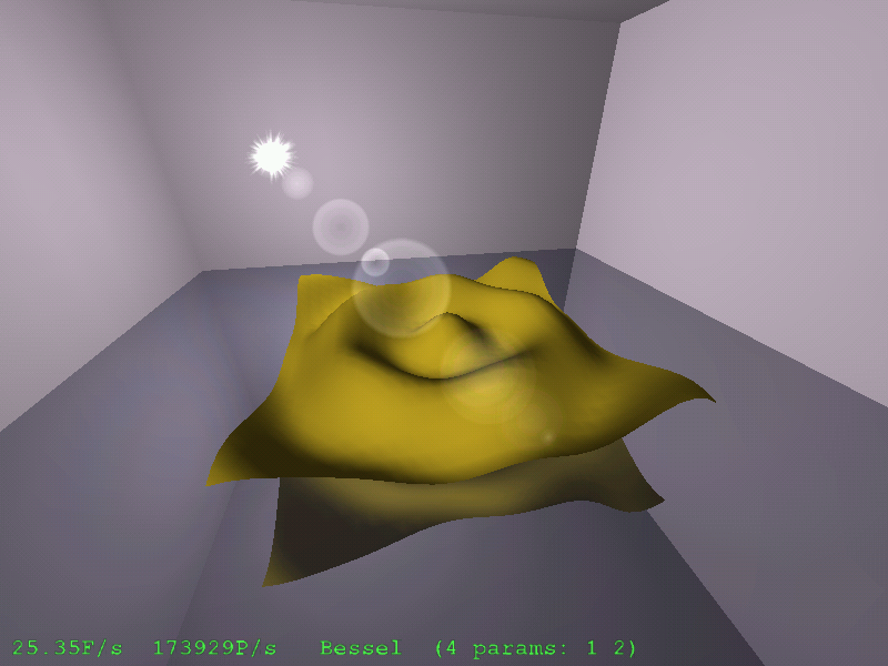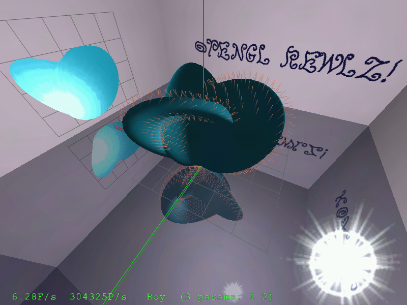 Some of the features included: multiple mirror images (with progressive fade), visible transparent clip plane for surfaces, visible transparent normals, visible shining lights (true spherical non projective), progressive lens flares (fading when hidden by surface), realistic wall lighting, surface projection on walls, stupid scrolling banner (wall wrapping), textures on surface (generated or pictures), texture fonts (sucked from X server), antialiased adaptative grids, fog for depth cuing, animated objects (surface, observer, light, clip plane...), animation speeds are frame rate independent, predefined display modes (from my old Apple][+ greenish point plot to mirror/fog/texture... voodoo2), predefined parametric surfaces (z=f(x,y) and (x,y,z)=f(u,v)), user input for parameters controling surfaces, unified PNG I/O for images/textures., stats (triangle/second and frame/second), comprehensive help screen ;)