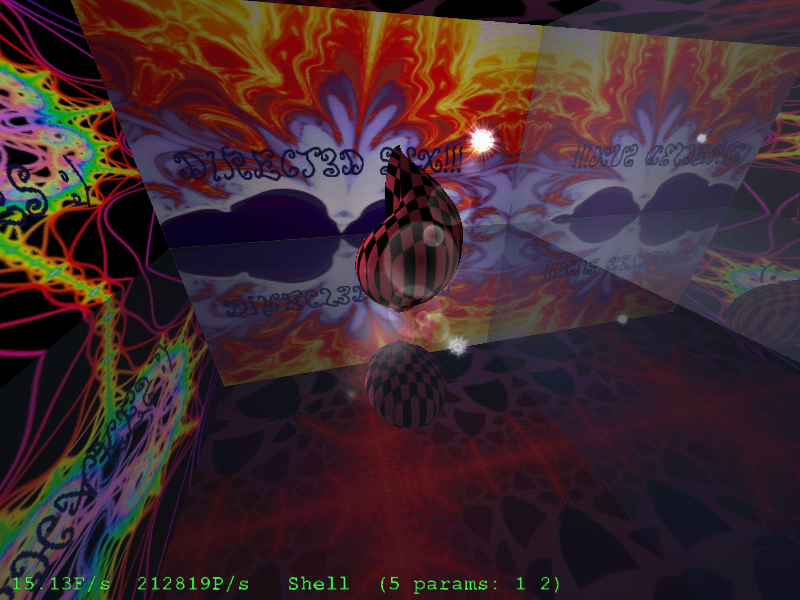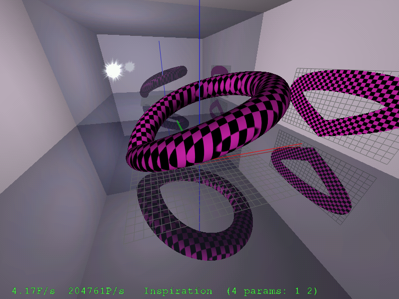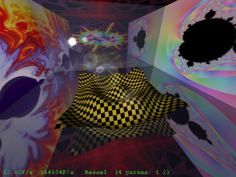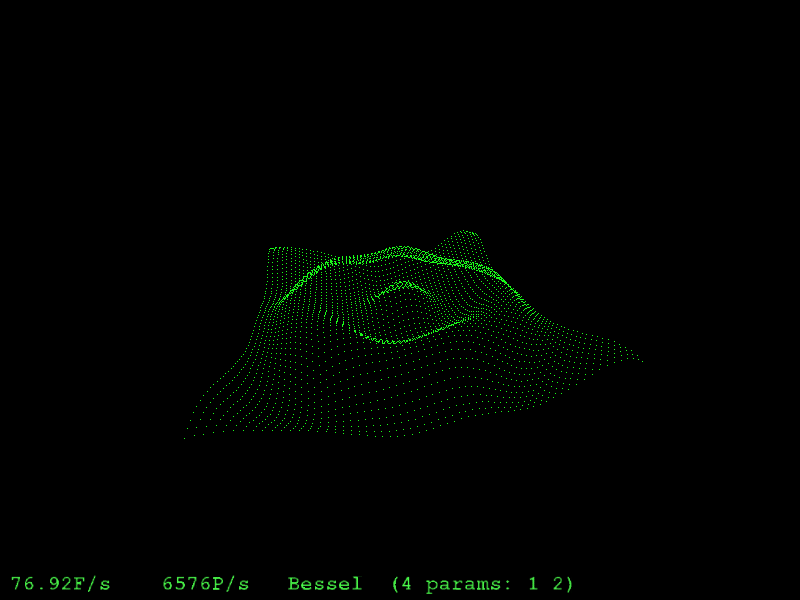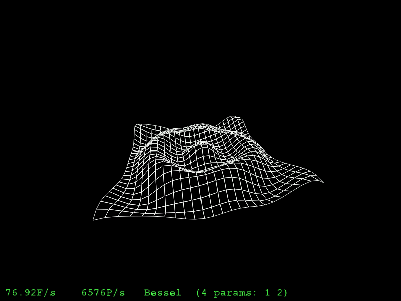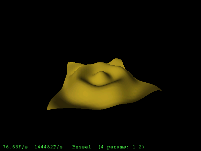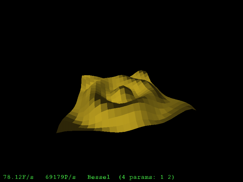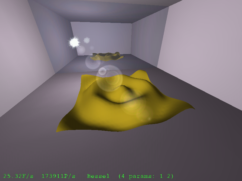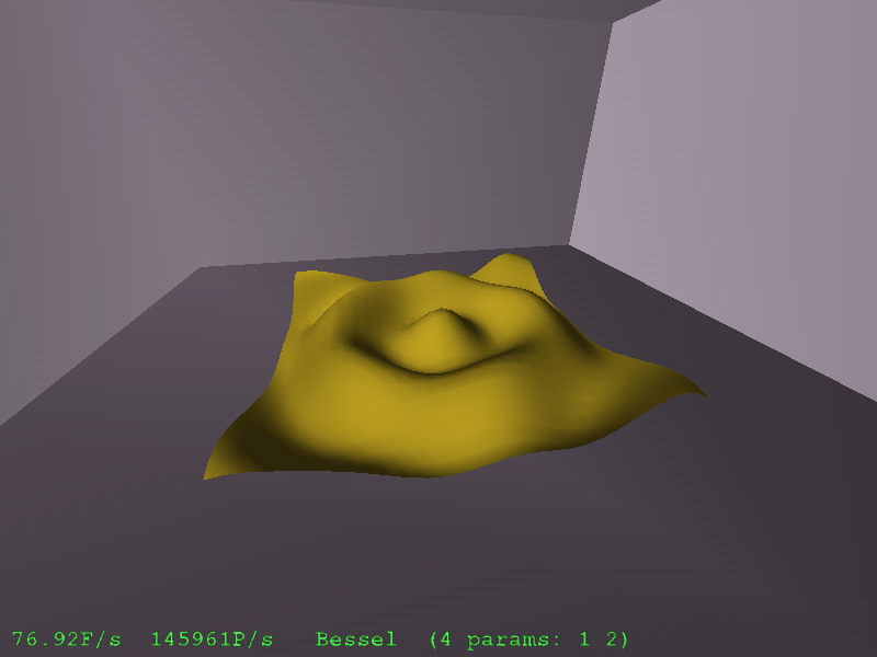 Some of the features included: multiple mirror images (with progressive fade), visible transparent clip plane for surfaces, visible transparent normals, visible shining lights (true spherical non projective), progressive lens flares (fading when hidden by surface), realistic wall lighting, surface projection on walls, stupid scrolling banner (wall wrapping), textures on surface (generated or pictures), texture fonts (sucked from X server), antialiased adaptative grids, fog for depth cuing, animated objects (surface, observer, light, clip plane...), animation speeds are frame rate independent, predefined display modes (from my old Apple][+ greenish point plot to mirror/fog/texture... voodoo2), predefined parametric surfaces (z=f(x,y) and (x,y,z)=f(u,v)), user input for parameters controling surfaces, unified PNG I/O for images/textures., stats (triangle/second and frame/second), comprehensive help screen ;)